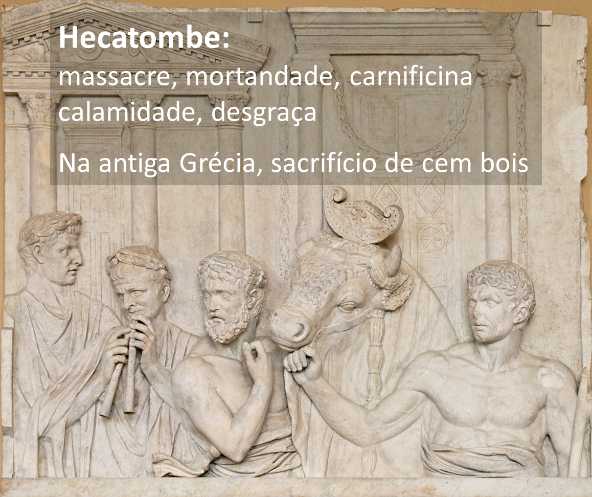 Do grego ἑκατόμβη (hekatombē) adaptado ao português pelo latim hecatombē: sacrifício de cem bois