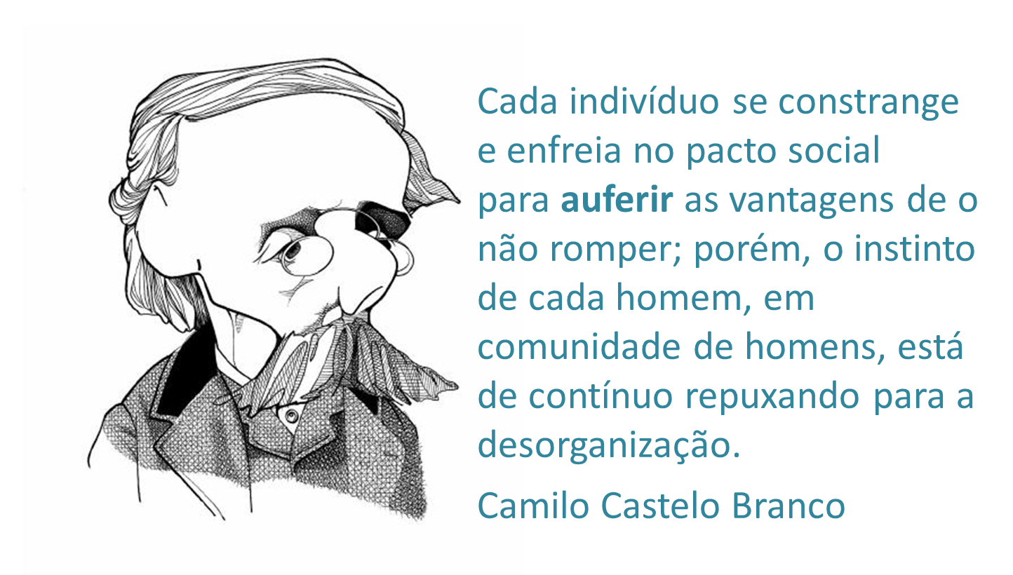 “Cada indivíduo se constrange e enfreia no pacto social para auferir as vantagens de o não romper; porém, o instinto de cada homem, em comunidade de homens, está de contínuo repuxando para a desorganização.” em O Homem foi Sempre Mau de Camilo Castelo Branco