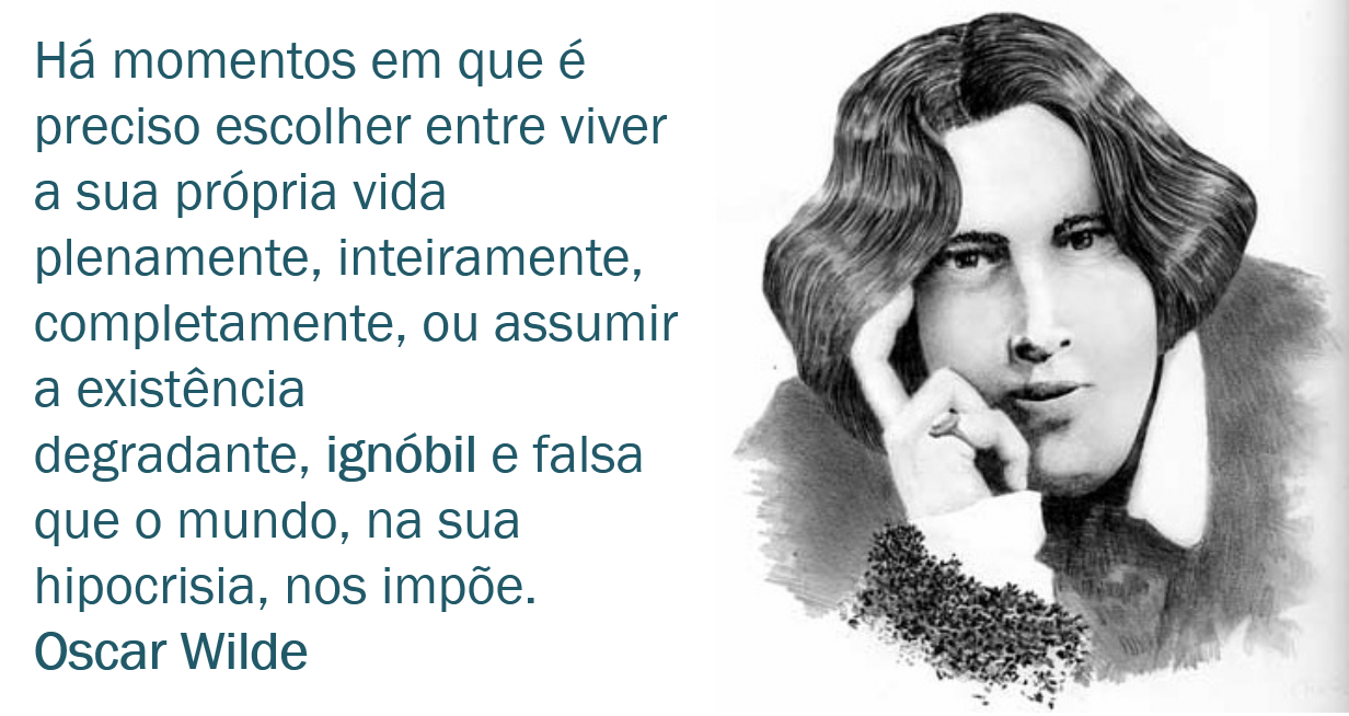“Há momentos em que é preciso escolher entre viver a sua própria vida plenamente, inteiramente, completamente, ou assumir a existência degradante, ignóbil e falsa que o mundo, na sua hipocrisia, nos impõe.” Oscar Wilde