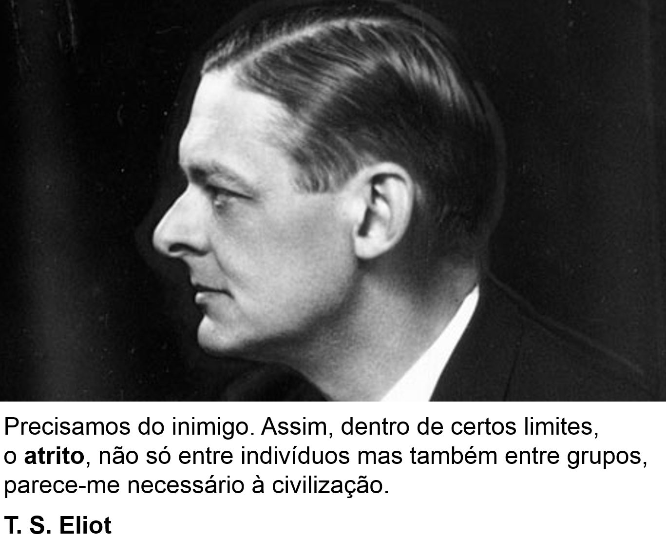 Precisamos do inimigo. Assim, dentro de certos limites, o atrito, não só entre indivíduos mas também entre grupos, parece-me necessário à civilização. Crescimento Cultural de T. S. Eliot