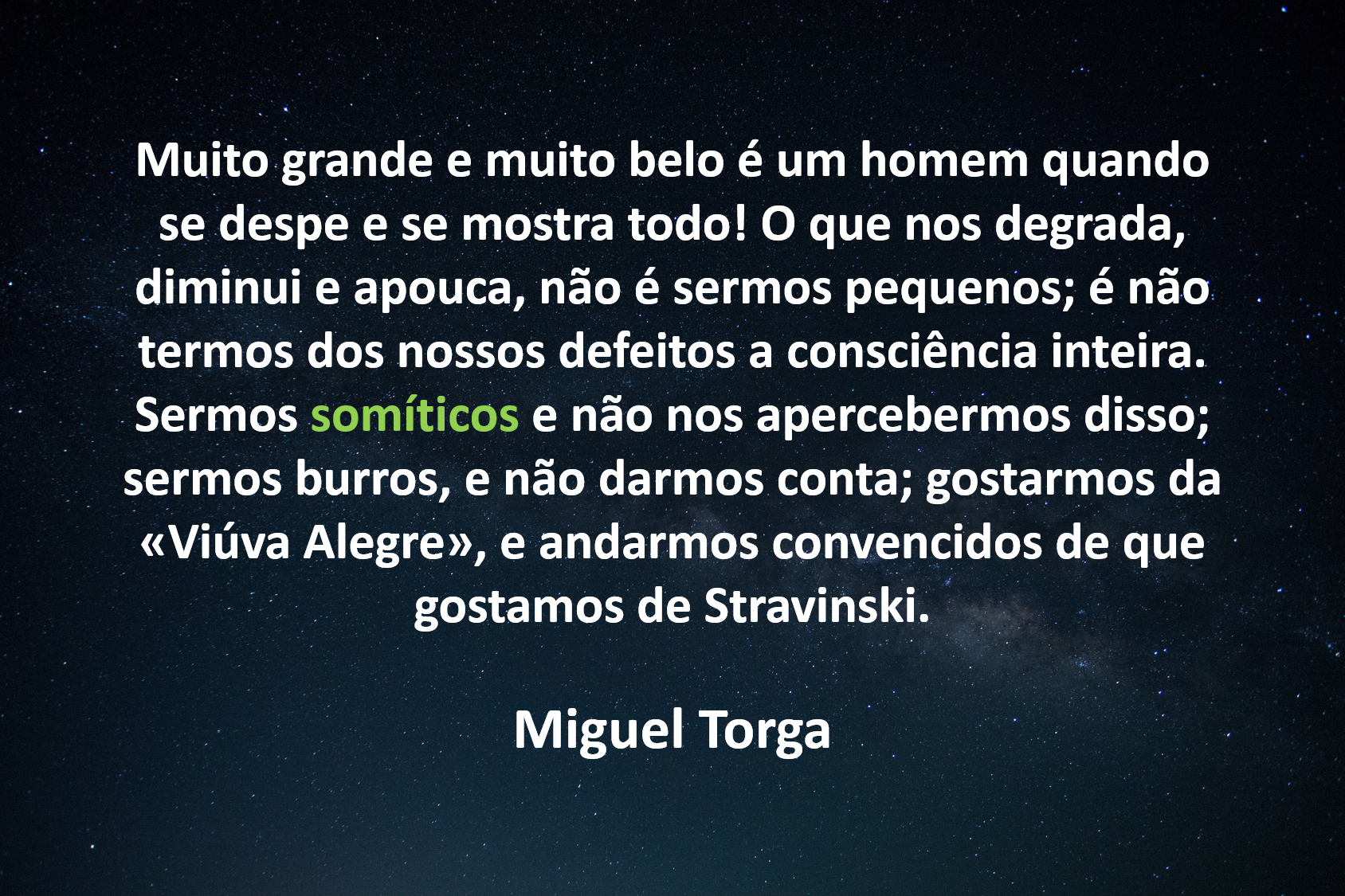 “Muito grande e muito belo é um homem quando se despe e se mostra todo! O que nos degrada, diminui e apouca, não é sermos pequenos; é não termos dos nossos defeitos a consciência inteira. Sermos somíticos e não nos apercebermos disso; sermos burros, e não darmos conta; gostarmos da «Viúva Alegre», e andarmos convencidos de que gostamos de Stravinski.” Miguel Torga